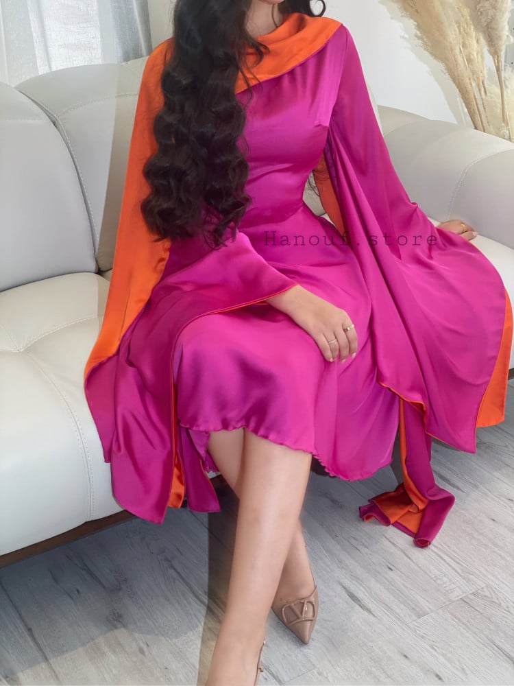 قطعة مميزه بانسجام من الوردي الصريح والبرتقالي، بقصّة أنثوية وأكمام طويلة تضيف لمسة من التميز، بطول ميدي يوازن بين التفرد والراحة