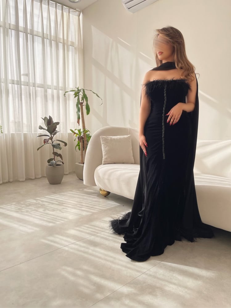 تصميم شتوي، مصنوع من قماش المخمل باللون الأسود، ليمنح إطلالة انسيابية ودافئة. يتميز الفستان بقصة طويلة مع تفصيلة ريش ناعم تزين الصدر، ومرفق بوشاح طويل من الشيفون الأسود