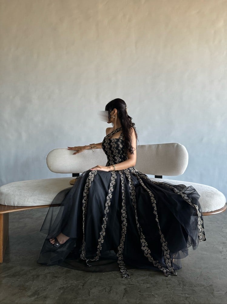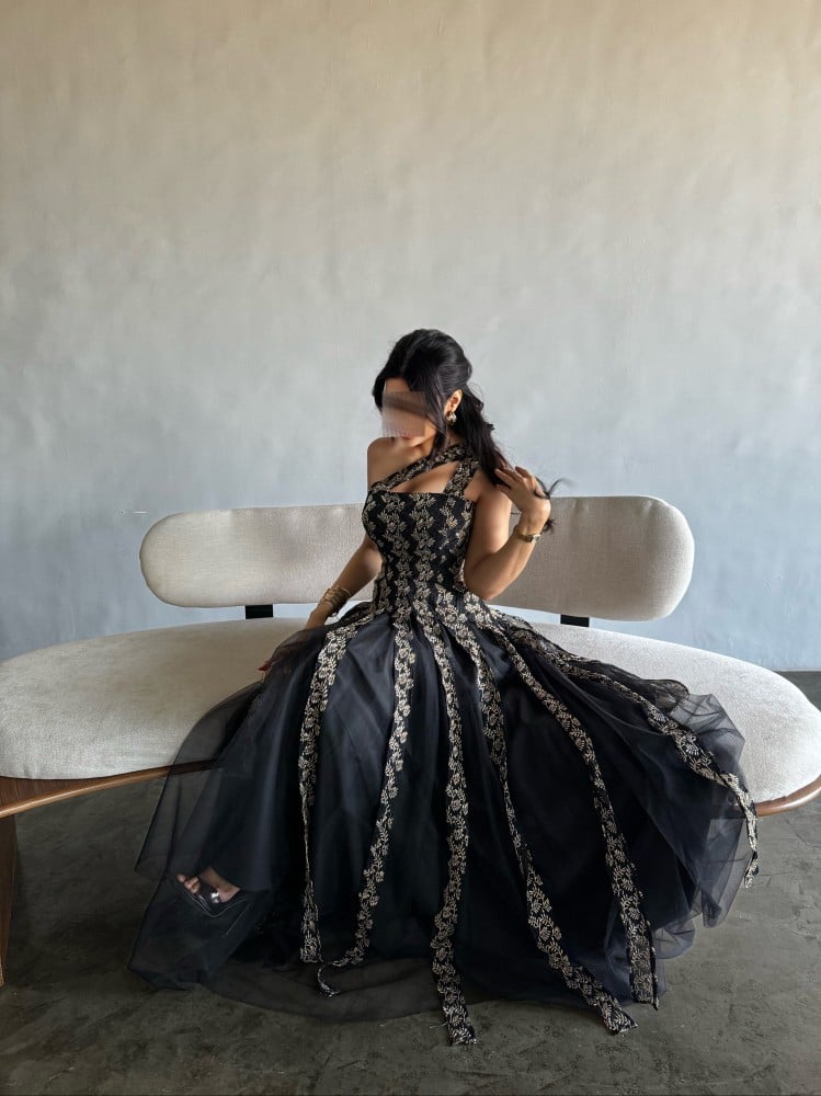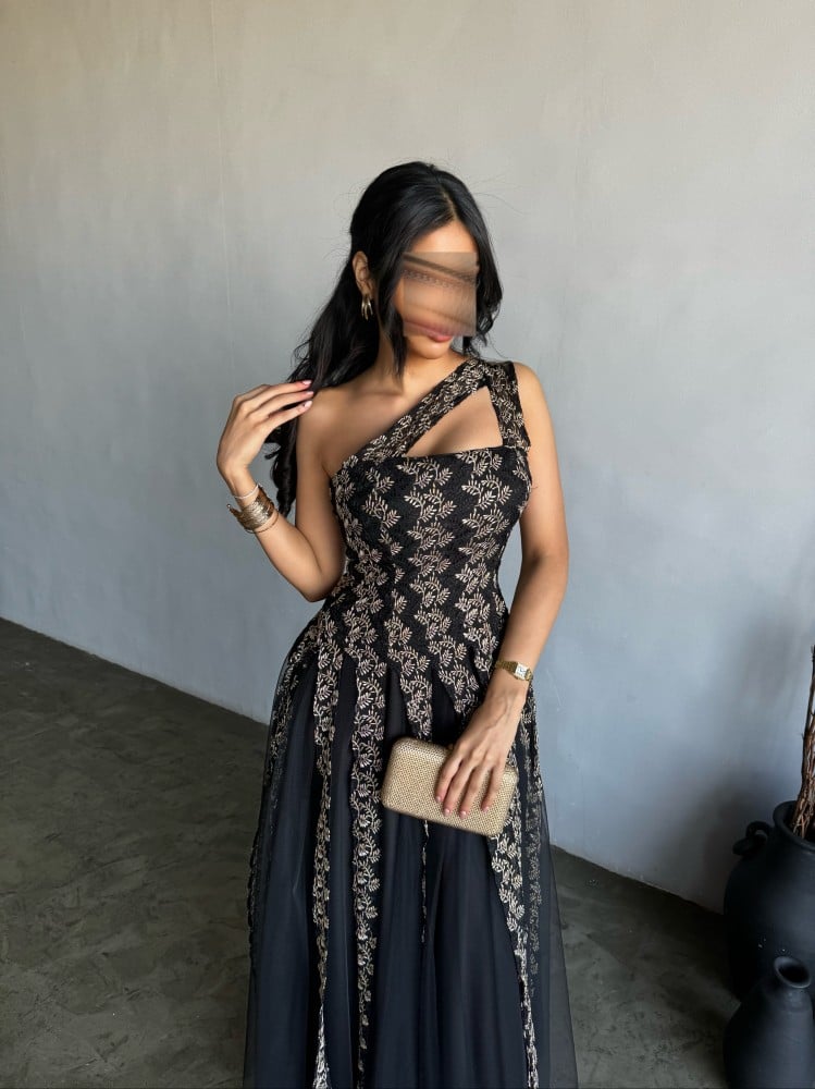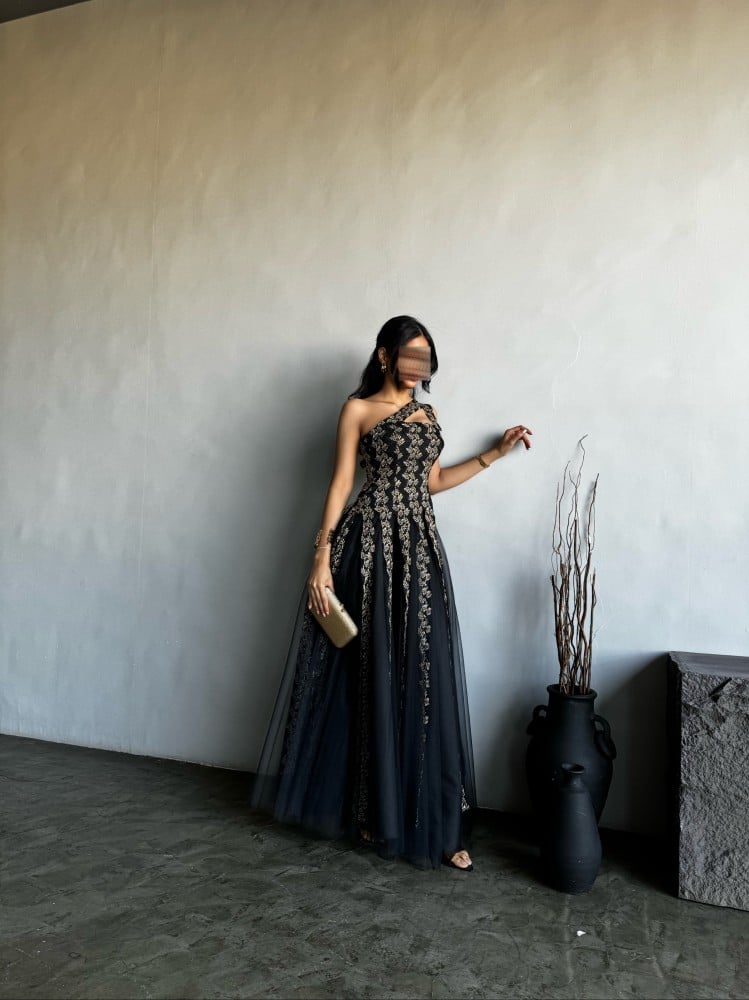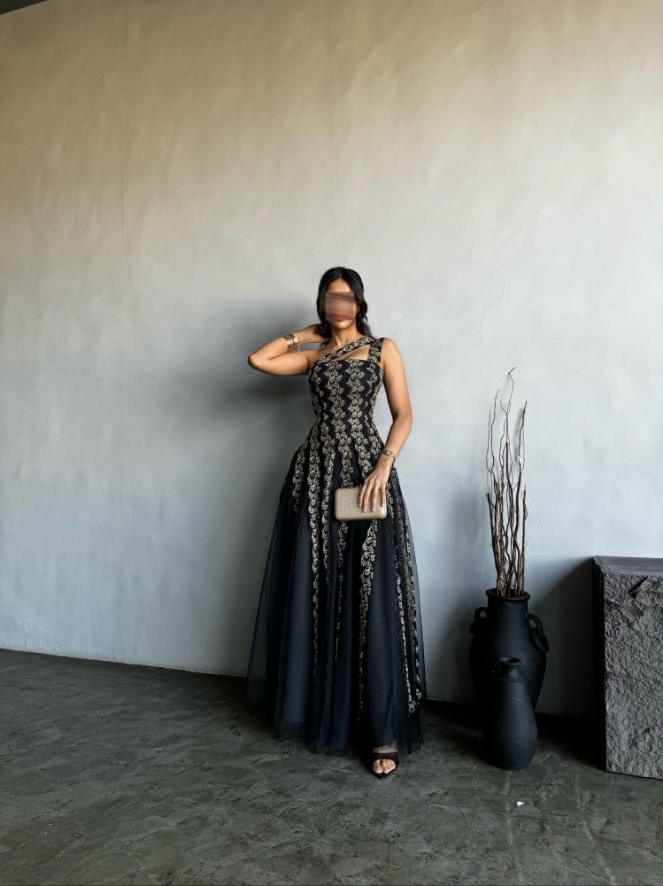 فستان أسود بطبعات ذهبية فاخرة وتصميم كتف واحد بتفصيل متقاطع على الصدر.