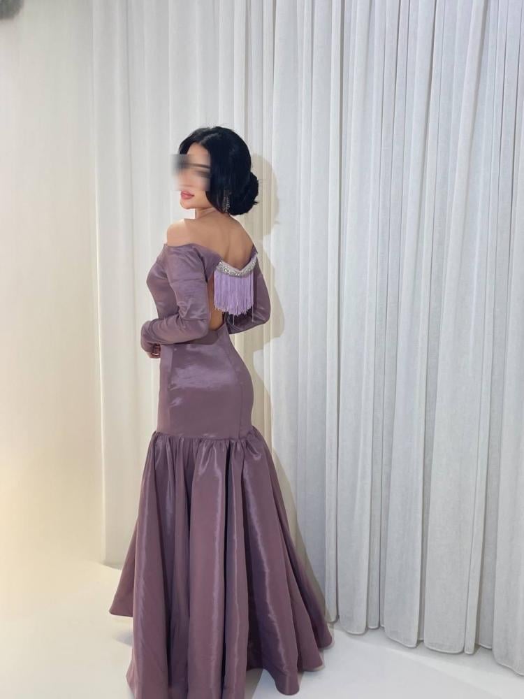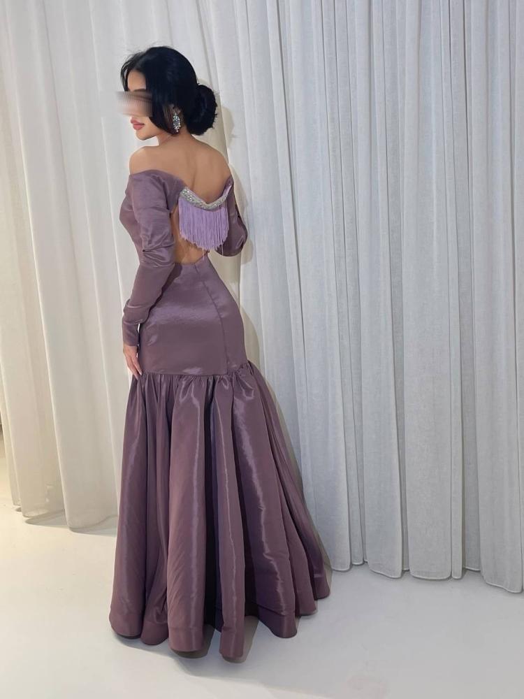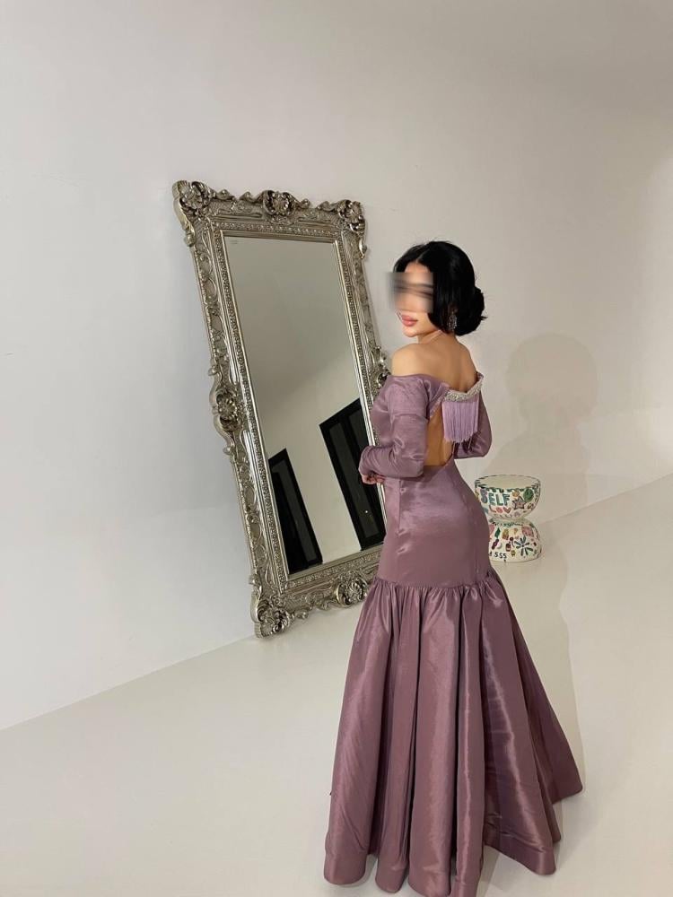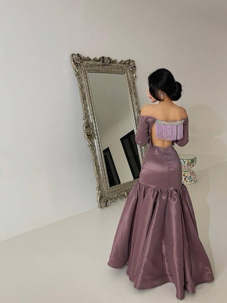 الفتحة: ظهر مفتوح مع تفاصيل ناعمة وكتف مكشوف.