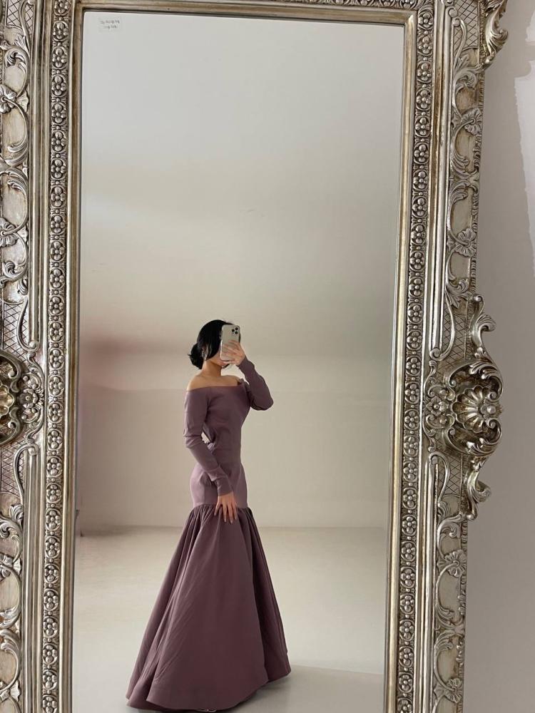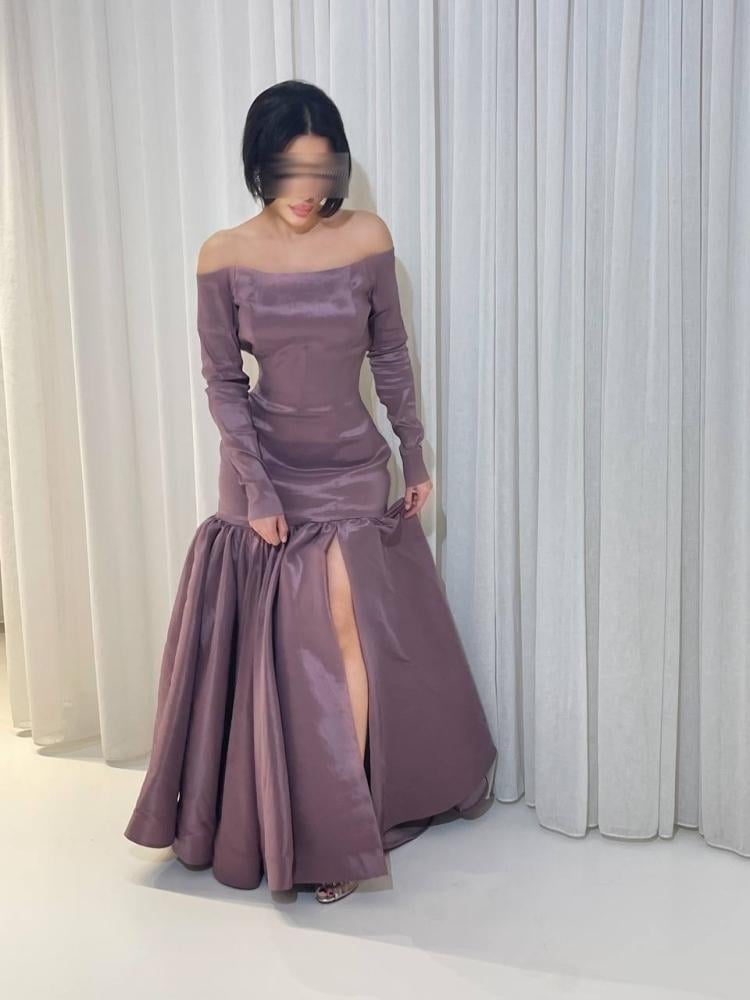 القصة: فستان طويل ضيق مع تنورة كلوش من الأسفل وشق أنيق.